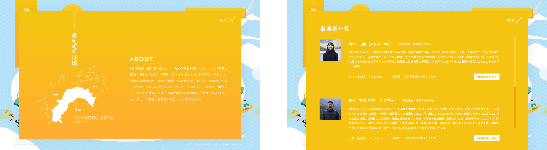 高知での暮らしを体験したい方、仕事や家を探している方、田舎暮らしに憧れている方へ。「見る地域。繋がる地域。」は、地方や高知へ移住したいけど、実際の暮らしがわからなくて不安に思っている方に向けた特設サイト、高知家で暮らす。のオフィシャルサイトを制作させていただきました。